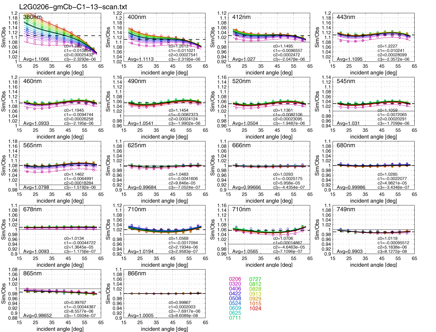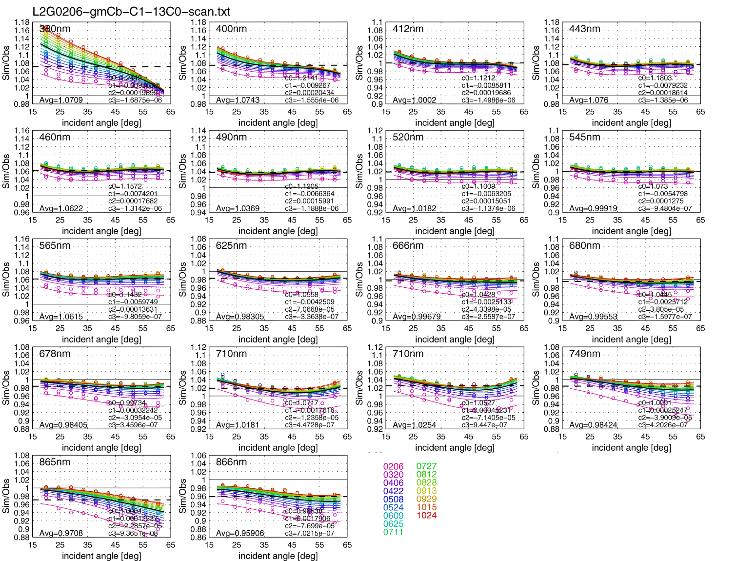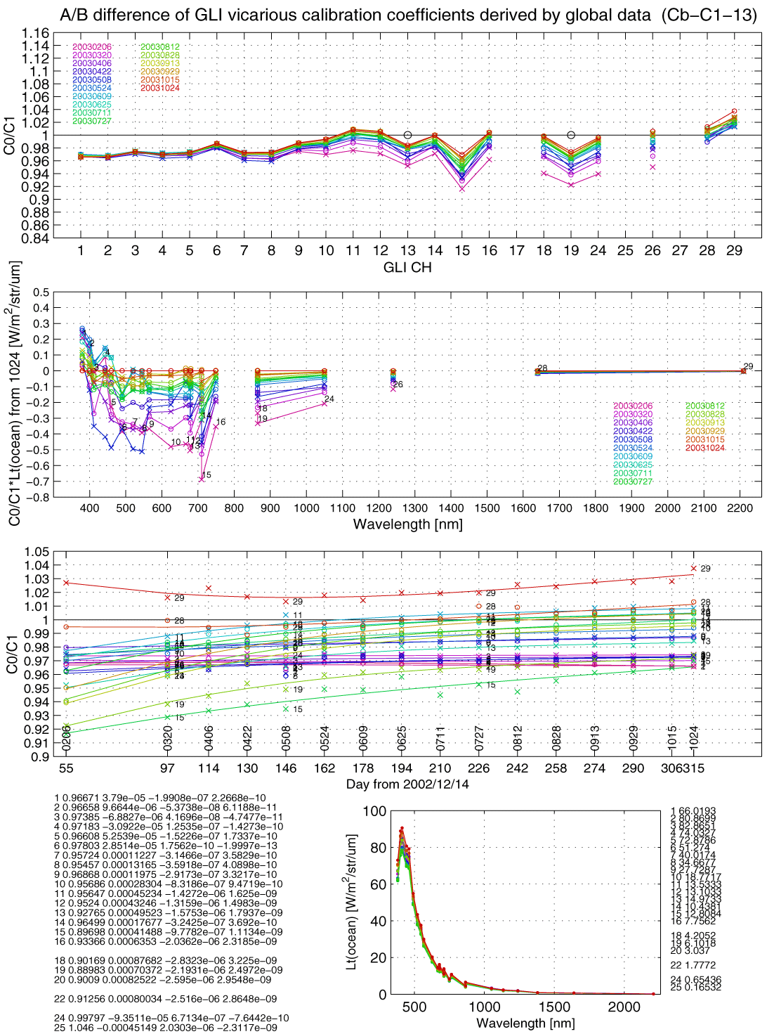 We are now investigating temporal and scan-angle dependencies of vicarious calibration coefficients (see a presentation in ADEOS-2 workshop).